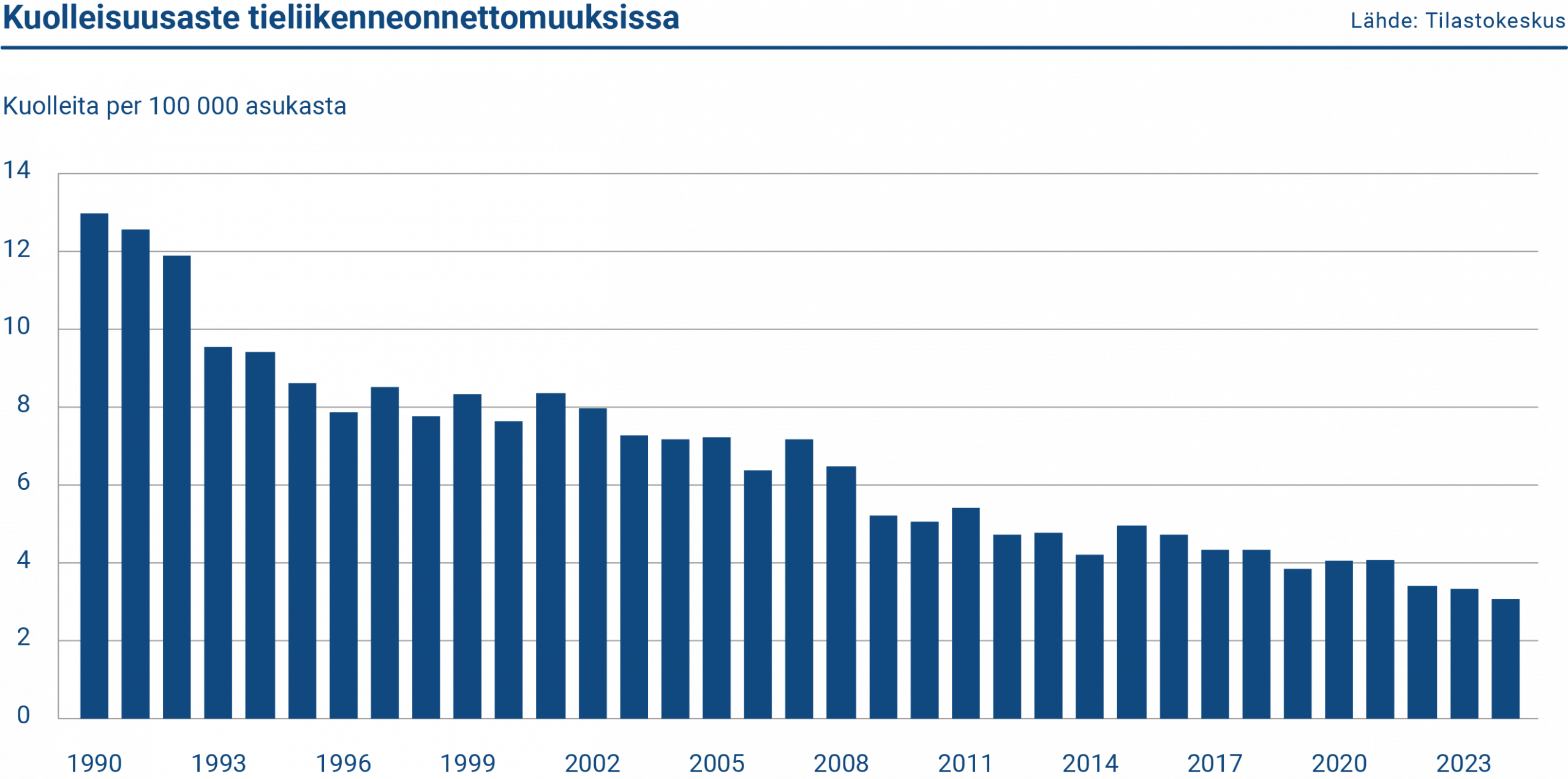 Kuviossa esitetään kuolleisuusasteen kehitys 1990-2024. Liikenneturvallisuus on parantunut Suomessa merkittävästi. Vuonna 1990 kuolleisuusaste tieliikenneonnettomuuksissa oli 12,98, mutta vuonna 2024 enää 3,05.