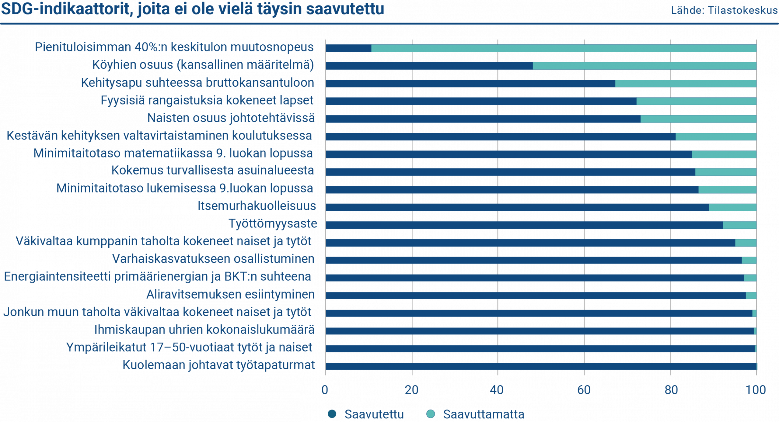 Arvioiden mukaan useimmat Agenda 2030 -tavoitteet tullaan Suomessa kuitenkin saavuttamaan. Edistyminen näissäkään tavoitteissa ei kuitenkaan ole täysin vailla ongelmia ja Suomen suoriutuminen monessa Agenda 2030:n 169 alatavoitteessa ja 248 indikaattorissa vaihtelee suuresti.